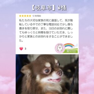 この度は大切な愛犬の葬儀を温かく執り行っていただき、ありがとうございました。突然の別れで何からしていいか分からない中、丁寧にご説明くださり本当に助けられました。私にとって特別に大切な愛犬だったため、最後はお家に連れて帰り […]